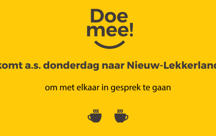 Doe mee! zoekt jullie op. Donderdag 2 februari vergadert de fractie van Doe mee! in Nieuw-Lekkerland over onderwerpen die op de agenda staan van de komende raadsvergadering. Een mooie gelegenheid om vooraf daaraan met elkaar- [...]